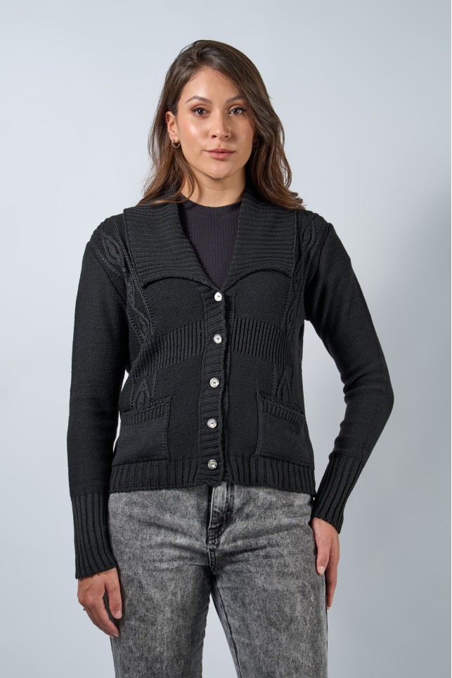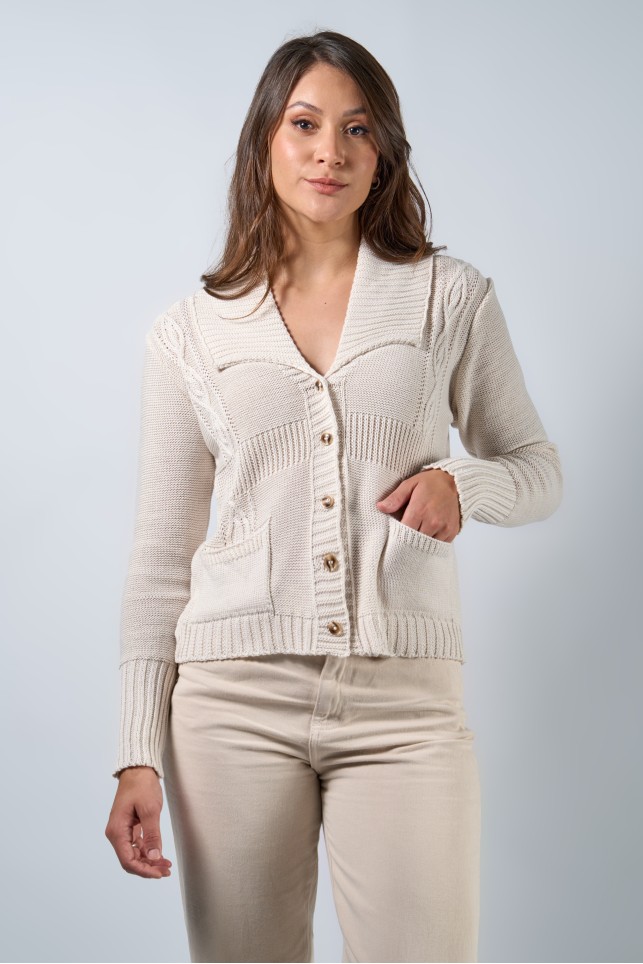 Confeccionado em tricot de textura delicada, possui modelagem confortável, gola clássica, fechamento frontal por botões e bolsos aplicados que trazem charme e praticidade à peça. Ideal para compor looks sofisticados e versáteis nos dias mais frescos.Composição: 100% poliéster.